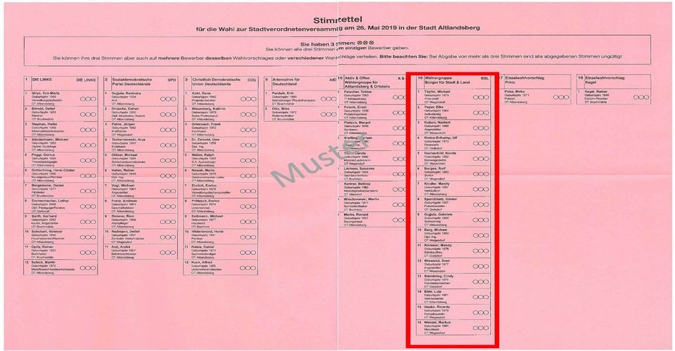 Auch hier haben Sie DREI Stimmen, die Sie wie bei der Ortsbeiratswahl vergeben können (Muster siehe Bild).